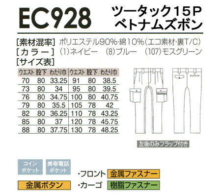 作業服の商品詳細 品 番 桑和 ec928 シーズン 春夏用 同商品の秋冬用モデル 9228 素 材 ポリエステル95%・綿5% カラー 1 ネイビー 8 ブルー 107 モスグリーン 二重織 制電性素材 涼しい ストレッチ素材 吸汗速乾 ソフト加工 イージーケア 機能詳細一覧はこちら 作業服の上下セットを選ぶ際は同シリーズからお選び下さい。