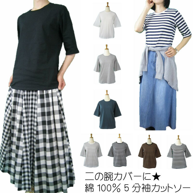 Tシャツ 五分袖 綿100% カットソー 汗じみしにくい ボーダー ゆったり 無地 パジャマ 部屋着 ルームウェア M.M.O エムエムオー 【送料無料】